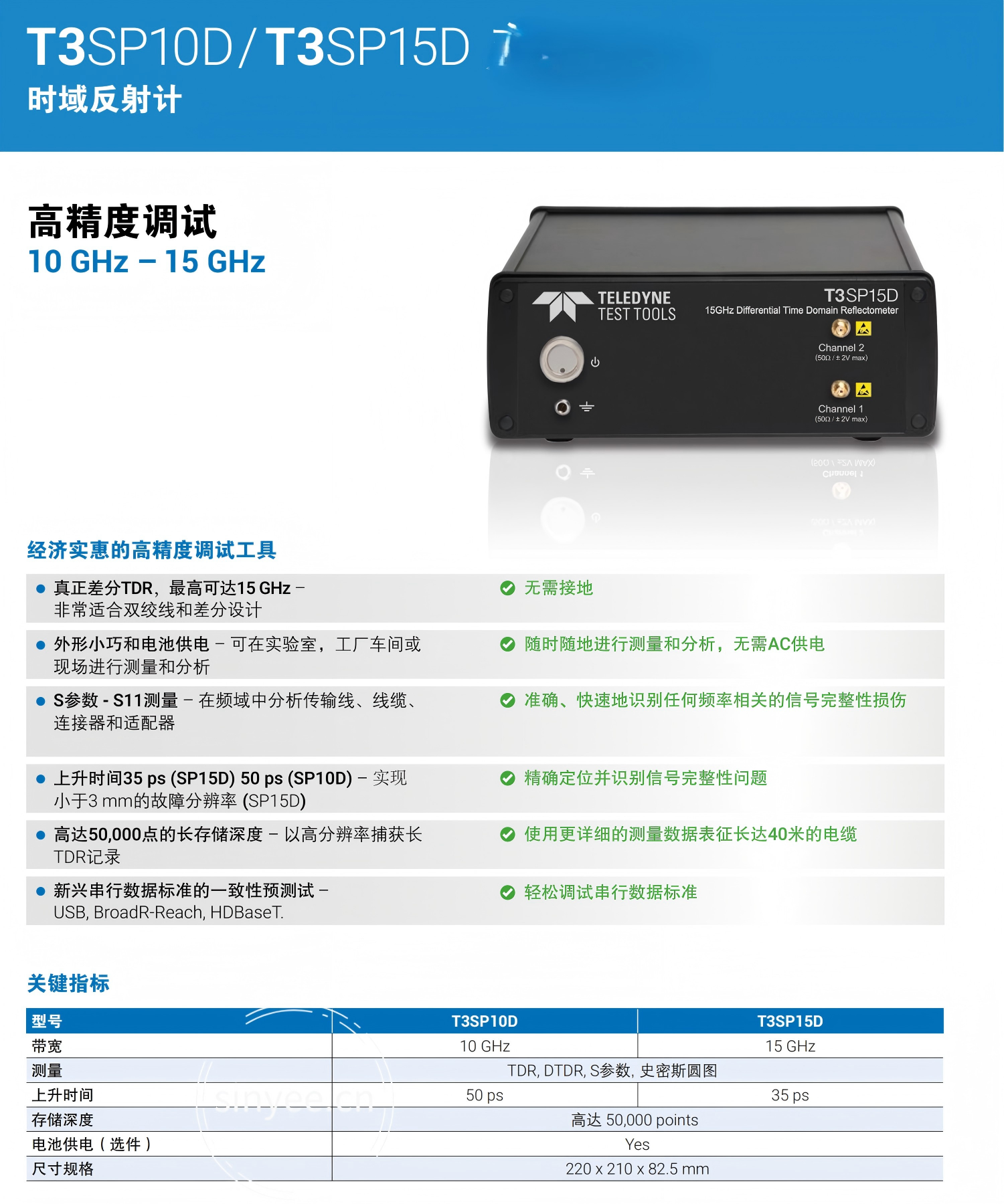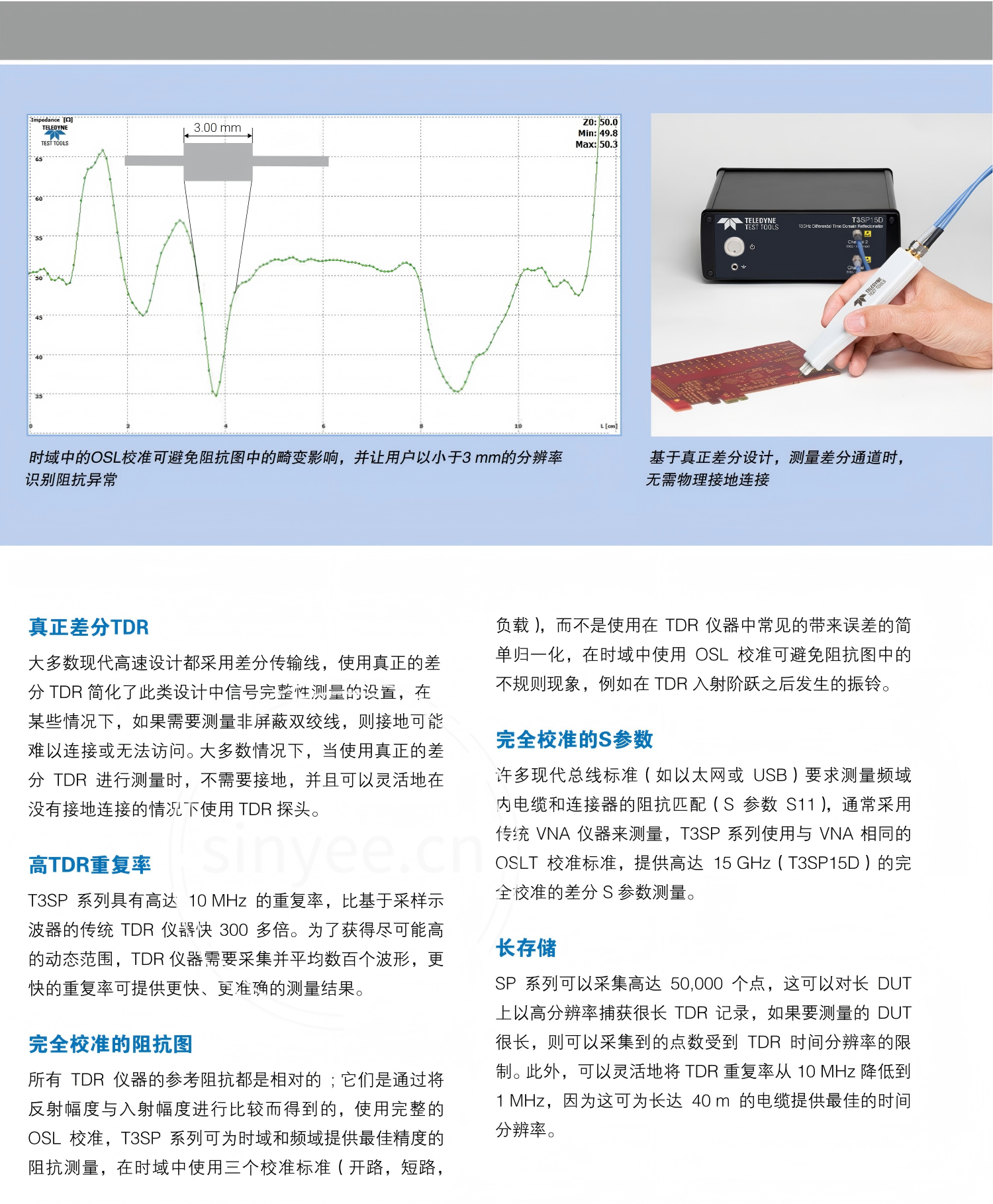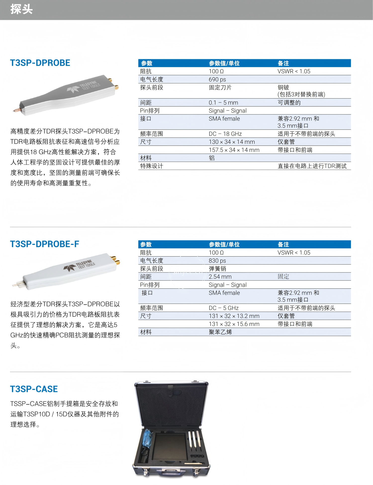 T3SP10D(10 GHz)和T3SP15D(15 GHz)通過真正的差分信號激勵DUT,TDR提供50 ps(T3SP10D)和35 ps(T3SP15D)的快速上升時間,故障分辨率(FR4)分別為4 2 mm和3 mm,DUT長度可達40 m,TDR采樣率最高可達10 MHz
