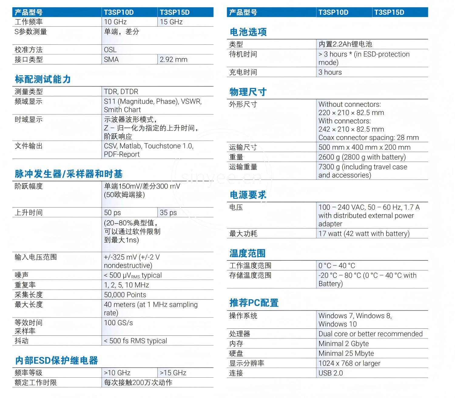 T3SP10D(10 GHz)和T3SP15D(15 GHz)通過真正的差分信號激勵DUT,TDR提供50 ps(T3SP10D)和35 ps(T3SP15D)的快速上升時間,故障分辨率(FR4)分別為4.2 mm和3 mm,DUT長度可達40 m,TDR采樣率最高可達10 MHz,并使用與矢量網(wǎng)絡分析儀相同的OSL校準標準。 由于外形小巧,重量輕,可選內(nèi)部電池供電,儀器可以在測試實驗室或現(xiàn)場使用。