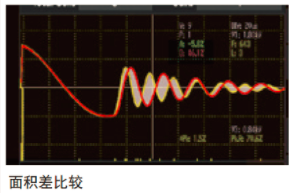 面積比較可用來檢測(cè)鉛酸電池芯的正負(fù)極板之間是否絕緣不良或隔離膜不存在。面積比較是將測(cè)試的波形總面積與樣品的波形總面積做差異比較,總面積的差異表現(xiàn)出了電池芯絕緣程度的好壞。當(dāng)電池芯正負(fù)極板之間的絕緣不良或是隔離膜不存在時(shí),在足夠的電場(chǎng)強(qiáng)度/電壓下會(huì)造成放電,瞬間的能量釋放導(dǎo)致波形瞬間快速衰減, 所以測(cè)試的波形總面積會(huì)比樣品的波形總面積小。
