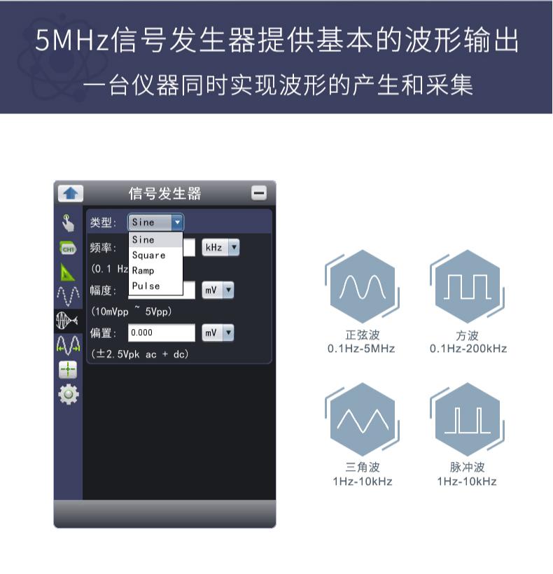 標(biāo)準(zhǔn)波形 | 正弦波(0.1 Hz - 5 MHz)、矩形波(0.1 Hz-200 kHz)、鋸齒波(1 Hz-10 kHz)、脈沖波(1 Hz-10 kHz) |