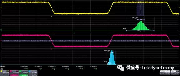 水平和垂直余暉直方圖都可以使用標(biāo)準(zhǔn)直方圖測(cè)量參數(shù)來(lái)測(cè)量,如圖中的測(cè)量參數(shù)P1-P6所示。示波器提供了大量基于統(tǒng)計(jì)的工具,可幫助分析采集的波形。幾乎每個(gè)示波器都提供平均和測(cè)量參數(shù)統(tǒng)計(jì)。直方圖、余暉圖和余暉直方圖通常是可選功能,本文使用的示波器是力科WaveMaster 8Zi-B,提供所有的分析工具,從噪聲中快速提取有用信息。