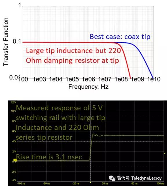 最小化10x無源探頭的前端電感很重要,在測量低阻抗電源軌時,任何前端電感都可能引起人為的振鈴,在前端增加一個大約200歐姆的串聯(lián)電阻會減少這種誤差,但也會將探頭的帶寬降低到100 MHz或更低。如果您的電源軌測試應用需要高于100 MHz的帶寬,請考慮使用諸如力科RP4030有源電源軌探頭之類的探頭,該探頭沒有此限制。