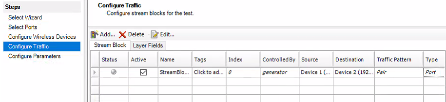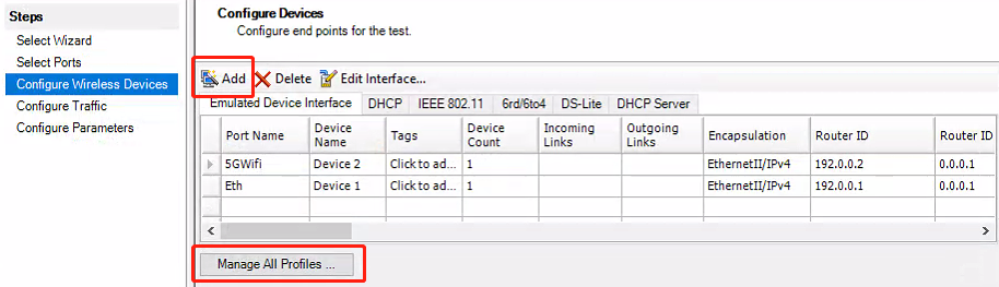 依次選擇要測試的端口,仿真Device和測試的流量。需要說明的是,為保證測試穩(wěn)定建議Device配置靜態(tài)IP地址,如果使用DHCP動態(tài)獲取,可能因?yàn)樵龃笏p導(dǎo)致DHCP用戶下線。